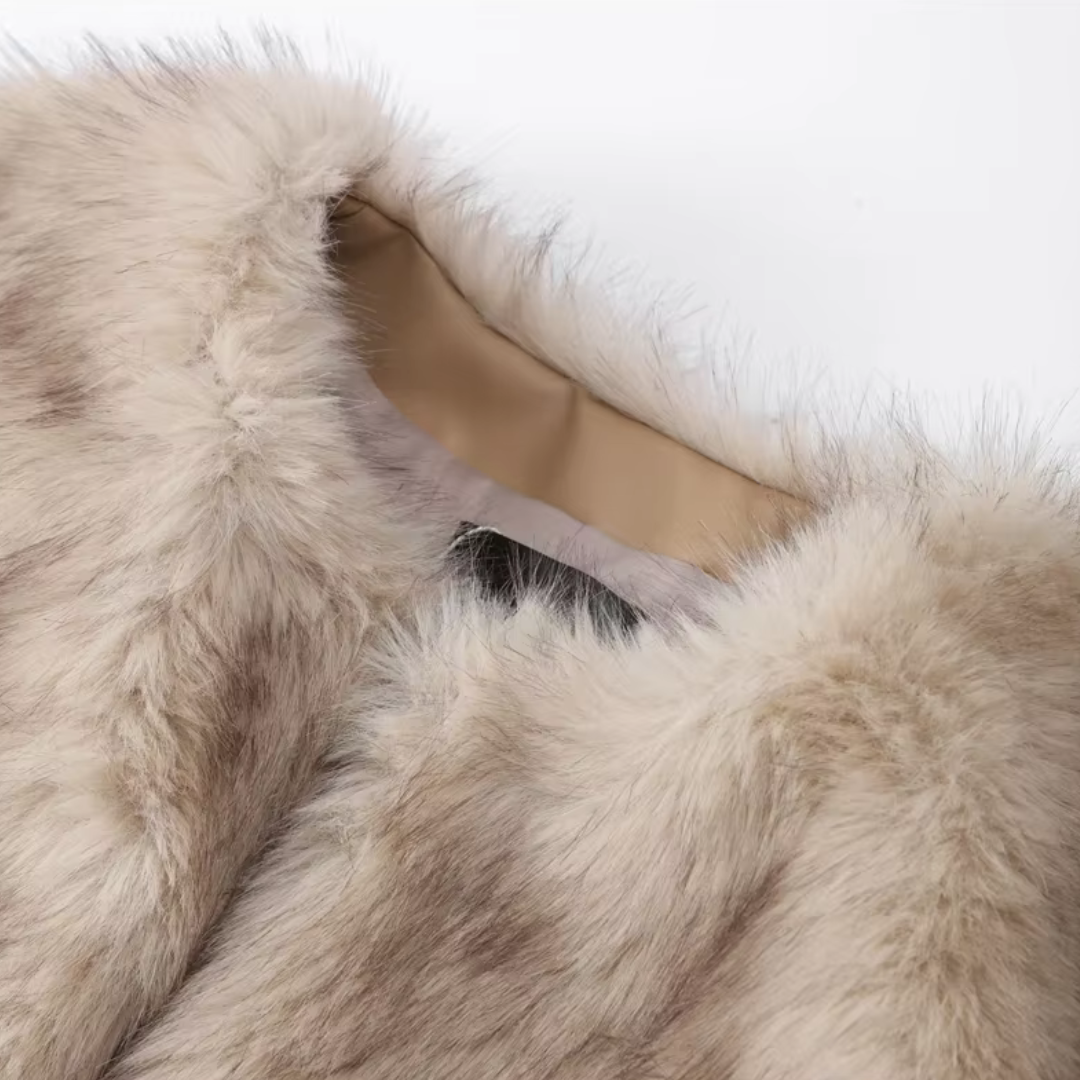 Das dichte Kunstfell in Champagne-Beige verleiht sofort rich girl vibes, während der voluminöse Schnitt und die weichen Ärmel ein Power-Statement setzen.