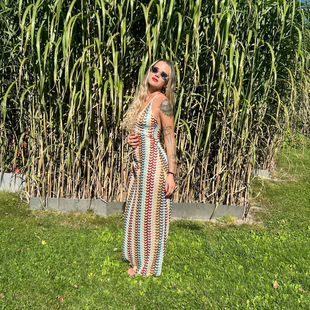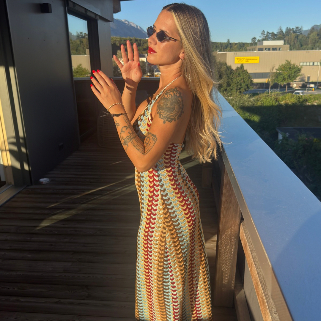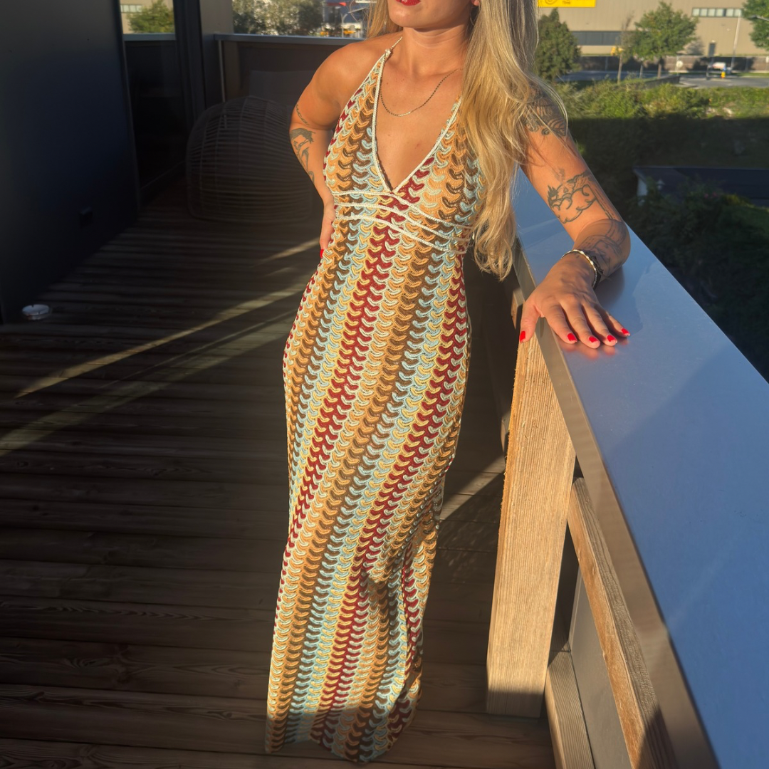 Das Häkel-Maxikleid in Multicolor-Streifenoptik ist ein echtes Statement für den Sommer. Mit tiefem V-Ausschnitt, Neckholder-Bindung und figurbetonter Silhouette bringt dieses Dress alle Blicke auf dich – ob auf einer Rooftop Party oder beim Sundowner-Dinner. Die gehäkelte Struktur sorgt für Luftigkeit und Stil in einem, während der bunte Farbverlauf deinem Look einen coolen Retro-Vibe gibt.